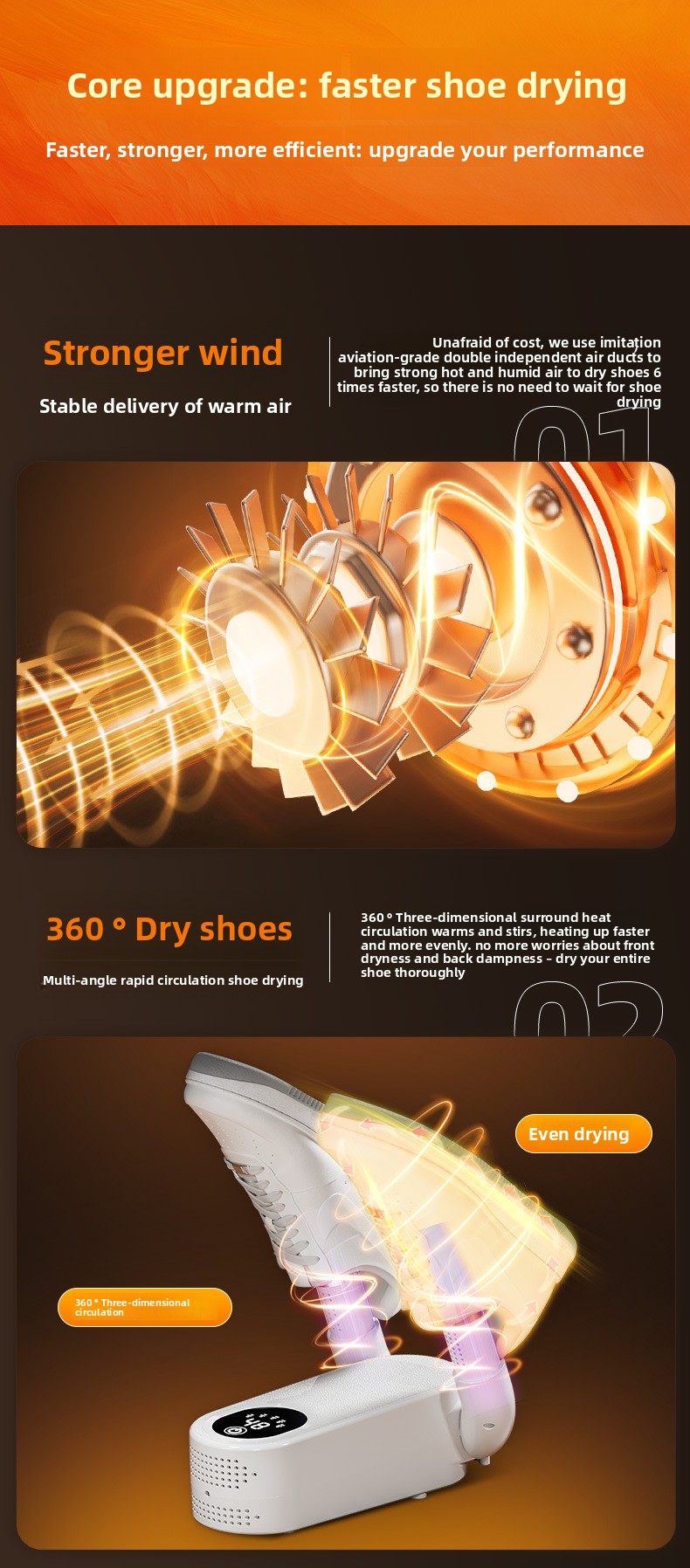Quick Drying: Efficiently dries shoes in short time using optimized heating technology.
